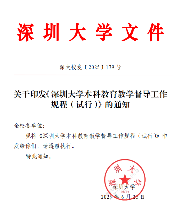 为深入贯彻落实立德树人根本任务,持续提升本科教育教学质量,深圳大学于2025年6月23日正式出台《深圳大学本科教育教学督导工作规程(试行)》,标志着学校构建起更加科学、规范、高效的校院两级本科教学督导新体系,充分彰显了学校对本科教学质量保障工作的高度重视与坚定决心。新《规程》“新”在这些方面:加强顶层设计,构建校院联动新格局。新《规程》是学校在进行深入调研省内外30余所高校先进经验、结合自身实际并吸纳审...
